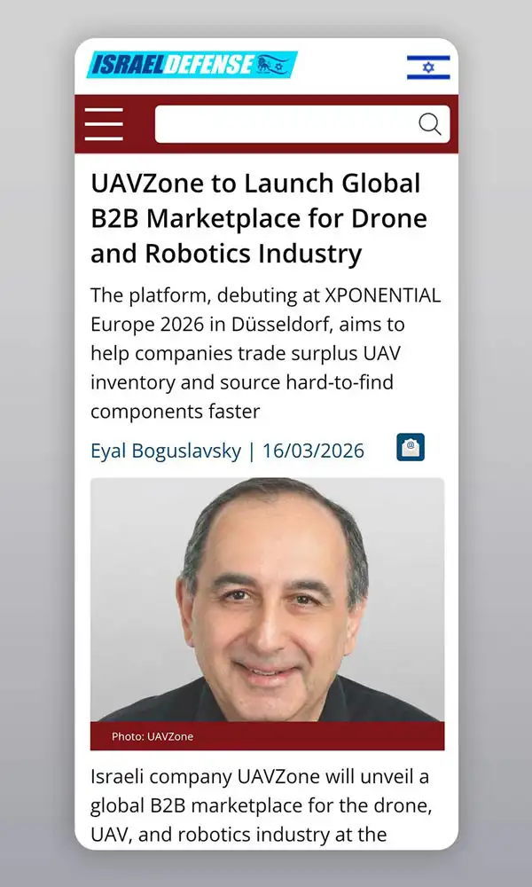 UAVZone has been featured in Israel Defense, a leading publication covering defense, aerospace, and security technologies. The article presents UAVZone as a global B2B marketplace